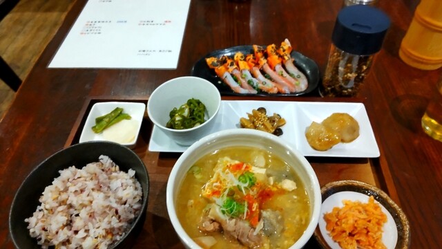 豚汁セット 1000円 (豚汁並盛り、ご飯、お漬物、おかず2品)、盛りアップ 100円、自家製サーモンフレーク、生ズワイガニの炙り刺し 500円