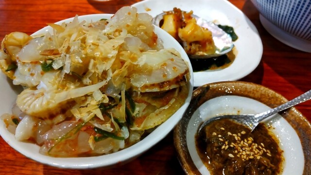 八堂八海宝漬 600円、蝦夷あわびのバター醤油焼 500円、肝ソース
