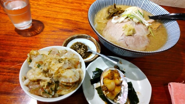 味玉味噌 1150円、八堂八海宝漬 600円、蝦夷あわびのバター醤油焼 500円、肝ソース