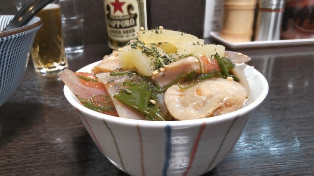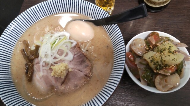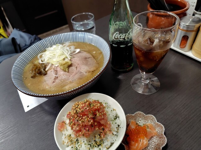 海鮮タルタル(サーモン、白つぶ、トビッ子) 350円、ゆめぴりか(釜炊き・北海道産A米) 250円、灼味噌らーめん 1200円、味玉 150円、山くらげ 300円
