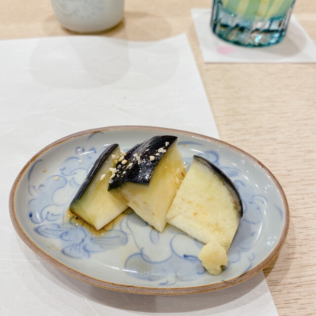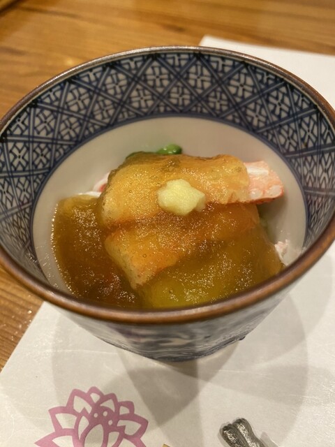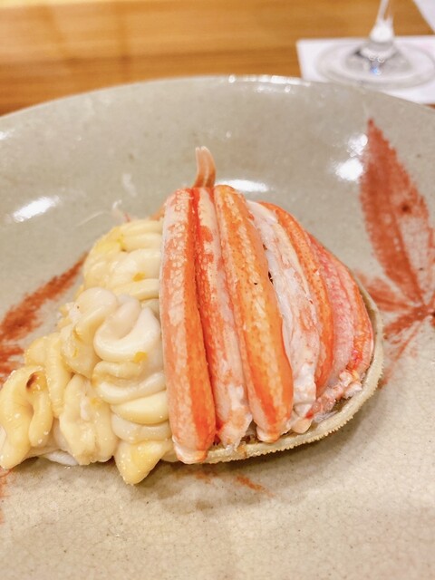 蕎麦前①先付:北海道産ズワイ蟹、焼き茄子