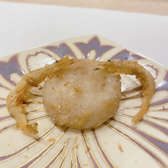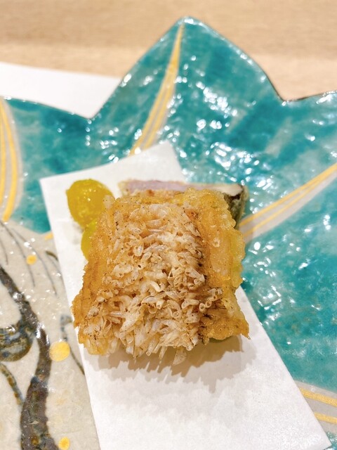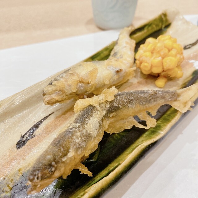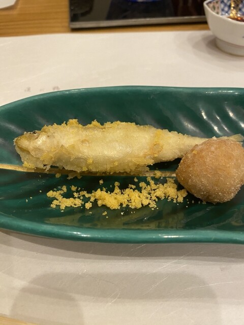 天ぷら:北海道産子持ちワカサギ、蓮根餅、カラスミ掛け