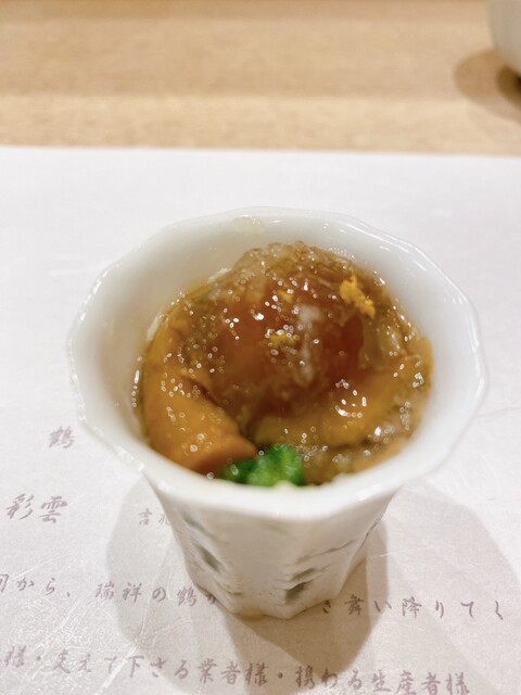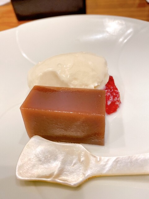 鯛のジュレは鯛の骨から抽出したうしお汁から仕上げられた様な味わい深さです。