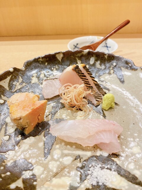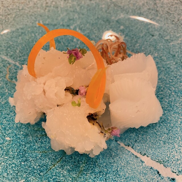 蕎麦前⑥お造り:活け〆鯛、北海道羅臼産鰤、長崎五島列島産泥障烏賊