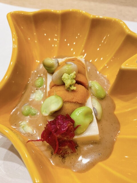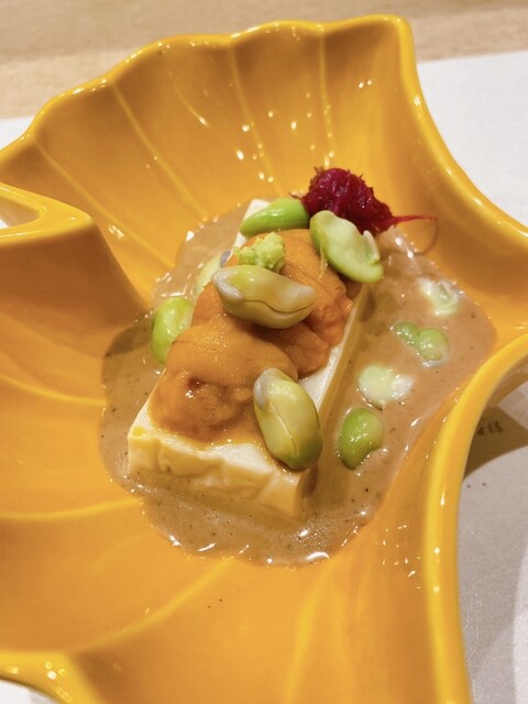 あん肝豆腐、ポン酢ジュレ、菜の花、百合根