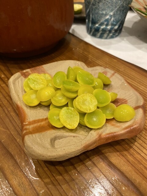 蕎麦前②前菜:シャインマスカット、イチジク、マスカルポーネチーズ、水茄子、粟麩、