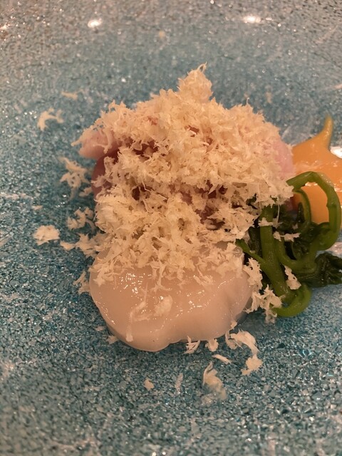 氷見産鰤、ホタテ、 山山葵掛け、蔓菜