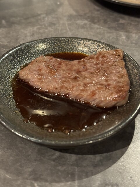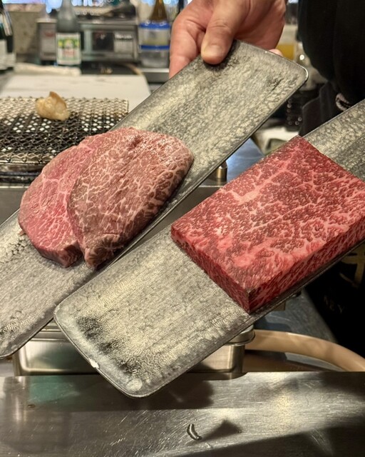 お店を切り盛りするのは、クロッサムモリタや岡田前で修業を積んだ加藤ご夫婦と、初代ミス日本酒の森田真衣さん。スタイルは“自分で焼かないフルアテンド焼肉”。カウンター12席だけの劇場型オープンキッチンでは、ご夫婦が目の前で絶妙な火加減で肉を焼き上げてくれるので、まるで肉のショーを見ているような臨場感があります。隣席との距離も広めにとられていて、一人でも心地よく過ごせました。