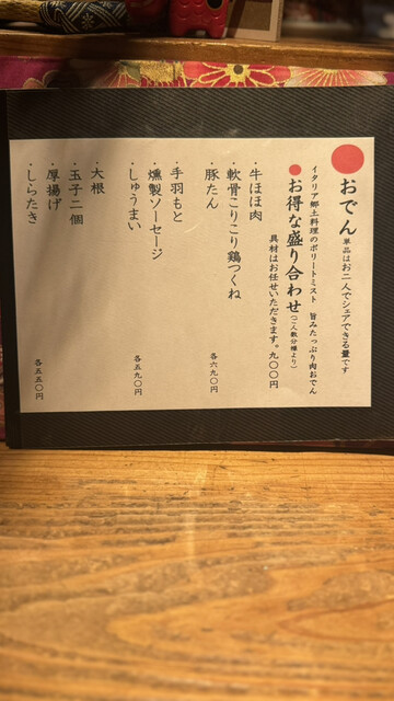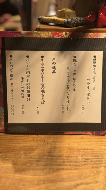 中でも印象に残ったのが「厚切り牛タン炭火焼き」。炭火の香ばしさと、驚くほど柔らかい食感がたまりません♪噛むたびにじゅわっと広がる旨みに感動。「鯛カマ煮」はふっくらと煮上がっていて、甘辛いタレがしっかり染み込んでいます。そして「おでん盛り合わせ」は一品一品がしっかり味が染みていて、心も体もほっこり。