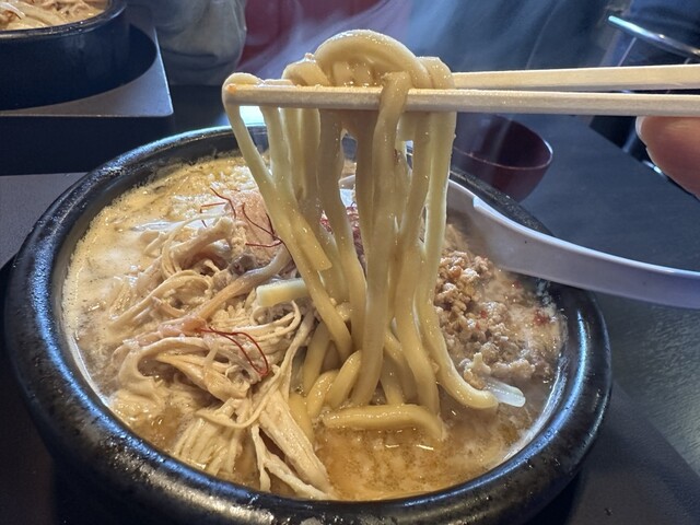 テーブル席で待つ。程なくして、ぐつぐつと煮えたぎっている石焼ラーメン着丼。美味しそ〜!