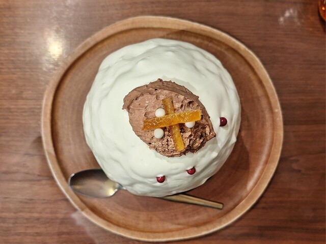 トップは自家製さつまいも生チョコ!周りは濃厚ココアパウダーだけど、中は意外とあっさりなスイートポテト感があり食べやすい!そして大きなさつまいもチップはスナック感覚でパリパリ美味しい!