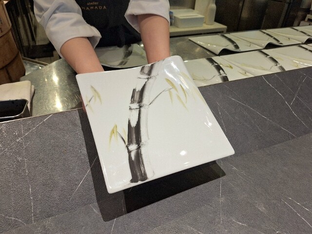 四角く白いお皿に、竹炭を使った黒い液体で竹を、抹茶を使った緑の液体で笹の葉を、筆で大胆に描いていました。