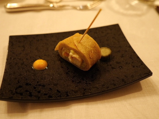 最初は蕎麦粉を使ったクレープで始まります。中身は何だったけ(笑)。鮭だったかな。