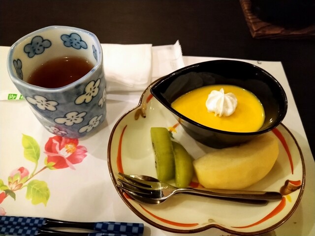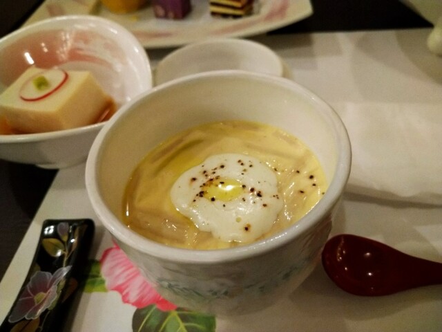 夜朝のコース料理には、同行者へのメニューにさり気なく