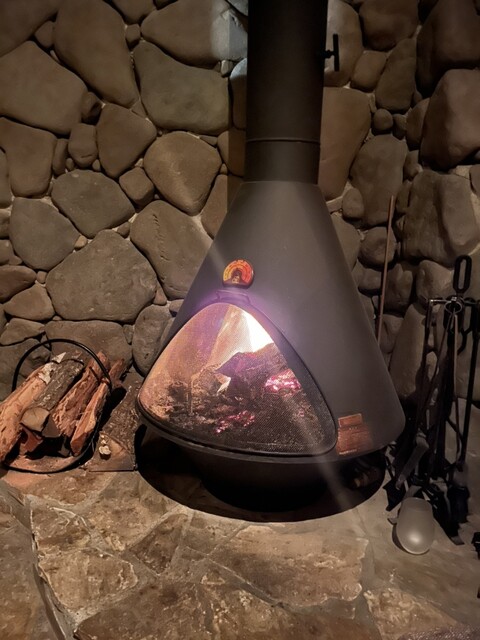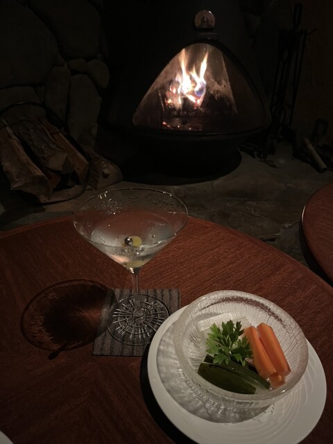 翌日は「暖炉」前のソファー席を予約。幸運なことに急に肌寒くなった今宵、24年初の火入れ。薪火の灯りと暖かさに安らぎ以外に湧く感覚は無し。
