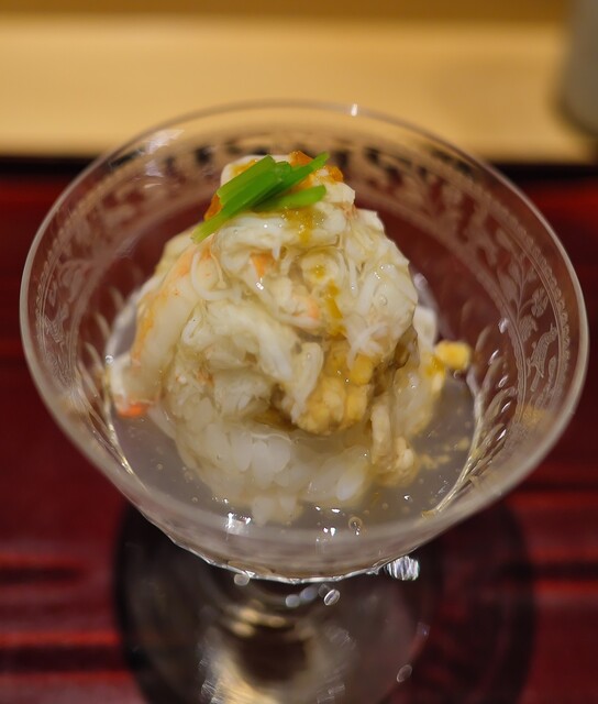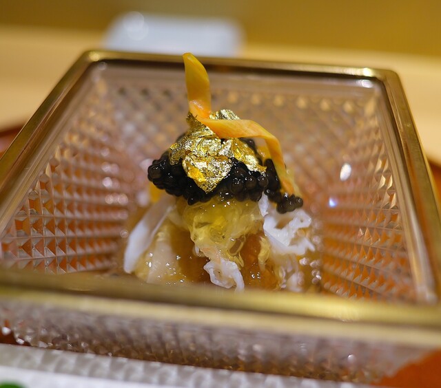 玉子豆腐にワサビの葉を置いて、シャコとウニ、カニ。加減酢の煮凝りで。