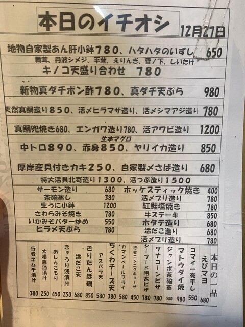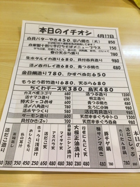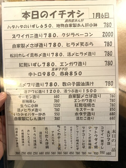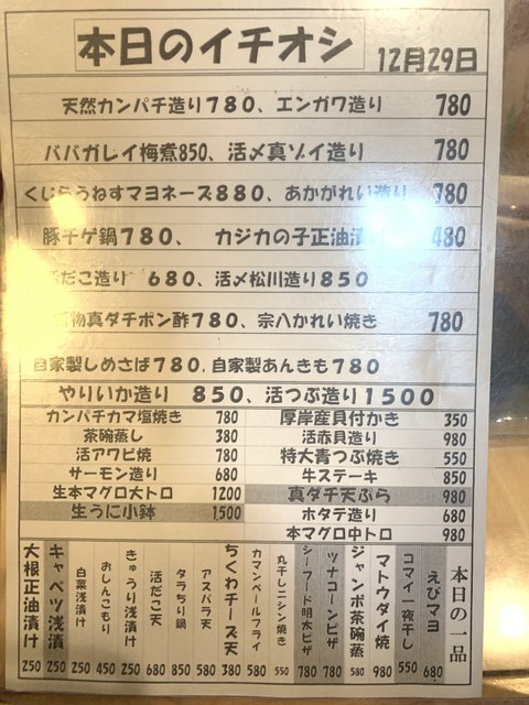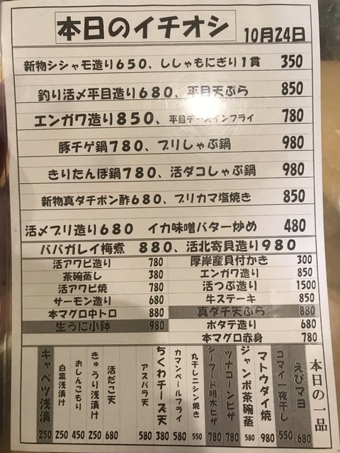 特大シャコめす 600円 生ホタルイカ造り 680円 活だこ造り 680円