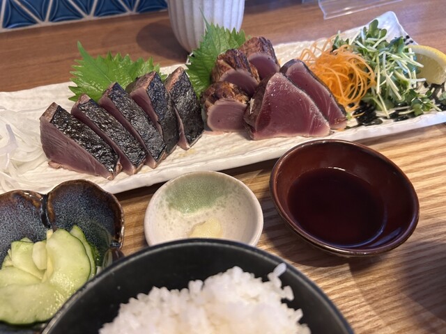 自分はカツオとブリの藁焼き定食(8切れ)を、友人はカツオの藁焼き定食の小(5切れ)を頼みました。