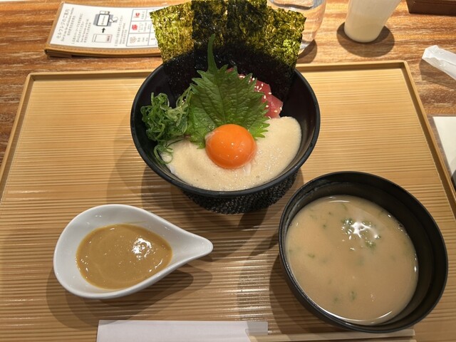 とろろをかけたご飯に赤身マグロ、そしてオレンジ色の黄身が艶やかで美しい。