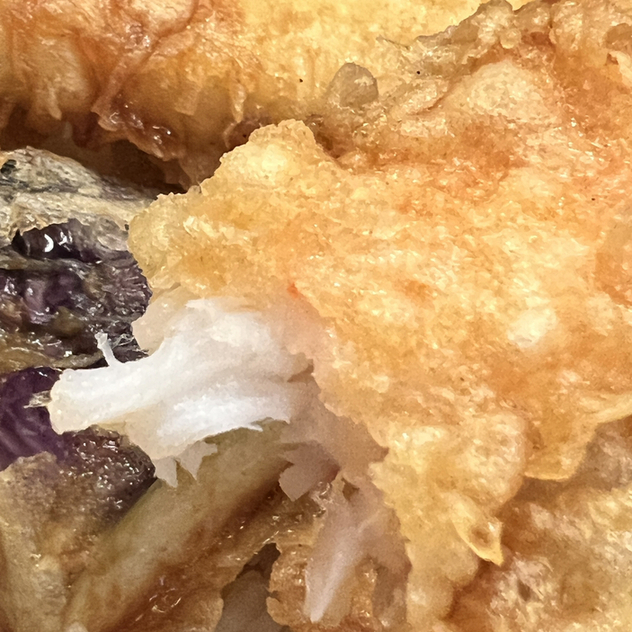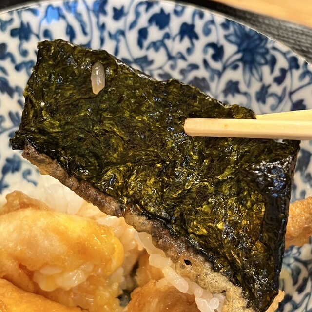 天ぷらの一番打者はなはり海老2本付きなので迷うことなくいっちゃいます。ぷりぷり感とモッチリ、サクサクのハーモニーが素晴らしい。次は、よけた先に隠れていたなす。ポッテリと甘味を感じます。次は、ピーマン。このピーマンが香りが良い。こんなに香りの立つピーマンは初めてです。そして、これまた隠れていた卵天。TKGができるほど温泉玉子くらい黄身がとろとろ。お次はいよいよ4番バッター、穴子の登場。小ぶりですがふっくらとし香りが良い。5番は鶏天関東の天ぷらではあまりか染みがないような印象ですが味もしっとりとした揚げ上がりこれも旨い。そして赤い天ぷら?なんだろうと思いながら口に運ぶとなんとトマト! これまでトマトの転ずるぷらは食べたこのがありません。しかし、以外と熱がはいり、酸味が抑えられ甘味が引き出されふわっとした食感が新鮮です。
