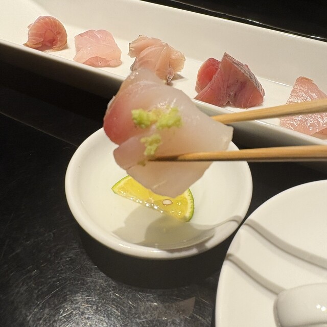 熟 真空氷温熟成のお刺身たち、目鯛、汐子、かつを、サワラに黒ムツ、天然ぶりどれも5〜9日低温熟成されねっとり、もっちり旨いなぁ。かつをも5日熟成。お酒は上喜元冷酒