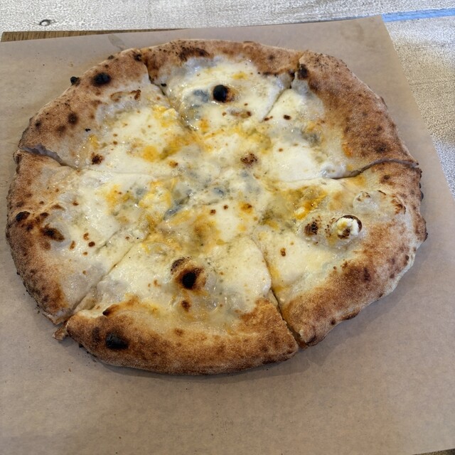 大きな石窯がで焼く手作りピッツァ。ハチミツ屋さんも併設しています。私、ハチミツがけのクワトロフロマージュ1900円とコーラ500円、家内は、マルゲリータ1500円と紅茶500円。オープンテラスで待つこと10分ほど。焼きたてのピッツァ登場。