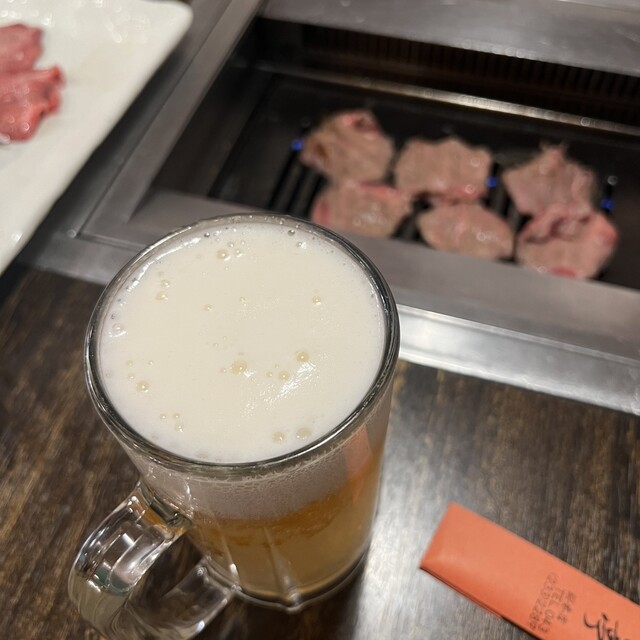 いつもののタン塩・カルビデラックスとタン塩・カルビ盛り合わせ500g、レバー2人前、石焼きビビンバ2つ、それぞれ飲み物です。