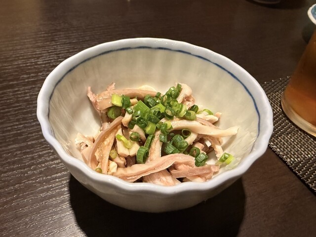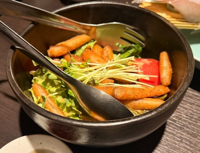 まずはお通しの鶏皮ポン酢。程よい酸味と葱の香りが心地よく、食欲をやさしく刺激してくれます。続いては「やましょうサラダ」。カリカリの揚げごぼうが香ばしく、野菜とアボカドに胡麻ドレッシングがよく絡んでいて、見た目も華やか。