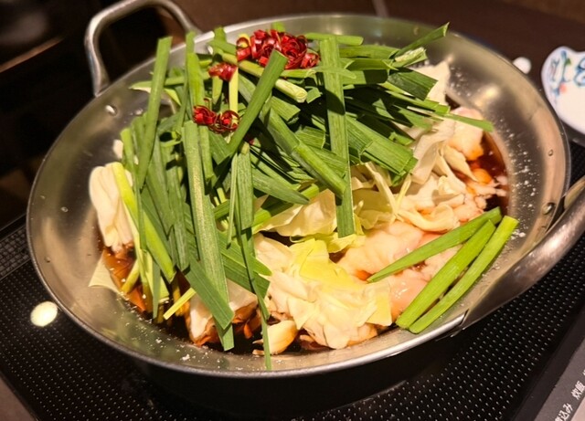 メインのもつ鍋は、やましょう特製の味噌ベースをチョイス。キャベツとニラがたっぷり、にんにくと唐辛子の風味が食欲をそそります。ぷるぷるのもつは臭みがなく、コク深いスープとの相性も抜群。締めの雑炊までしっかり楽しめて、最後の一口まで大満足。