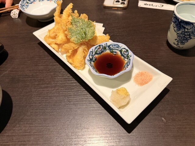 そして目玉の呼子イカの姿造りが登場。透き通るほど新鮮な身は甘みが強く、噛むほどに旨みが広がります。ゲソは後から天ぷらにしていただけるのも嬉しい演出で、さくっと揚がった衣の軽さとイカの柔らかさの対比が絶妙でした。