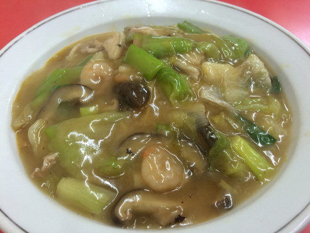 からしを和えた中華麺に野菜・鶏肉のあんがかかっているもので、麺をずるずるっと啜るたびにからしの風味が広がってこれはクセになります。