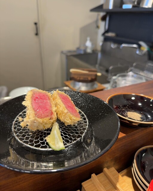 そして牛カツですが、ランプとは思えない程の和牛の脂で、ブラックペッパーと岩塩、酢橘をかけて頂きました。