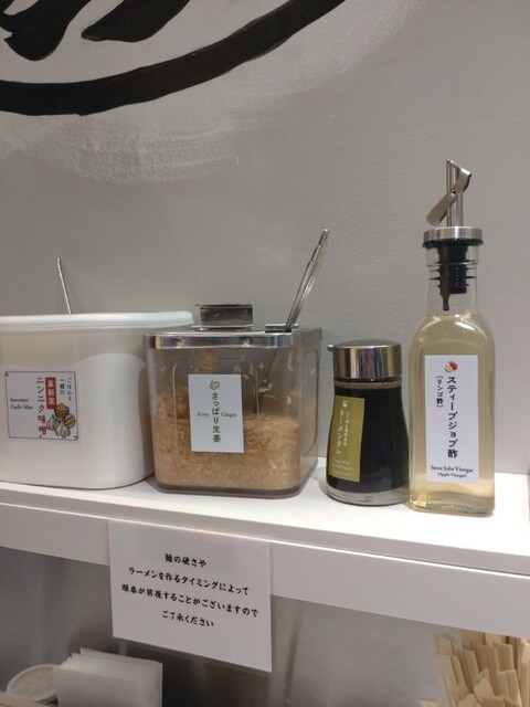 お冷は先にセットされており卓上アイテムはリンゴ酢、らーめんタレ、等の一般的にあるタイプ