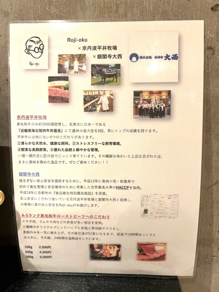 京丹波平井牧場の黒毛和牛A5ランクのローストビーフを使用。京都といえば銀閣寺大西さん、こことのコラボなんだね。