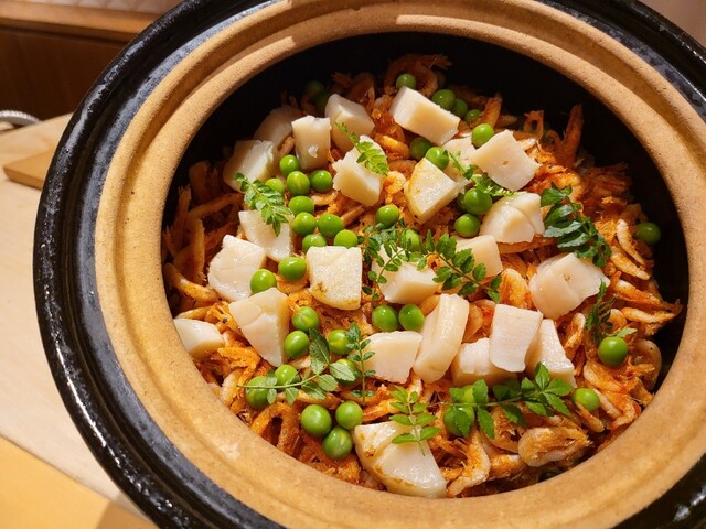 桜海老、ホタテ、うすい豆の炊き込みご飯。