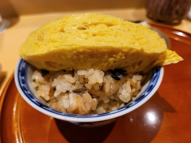 お茶碗に盛られたご飯の上には、どーんと卵焼きを乗せてくれます。これも美味しい。