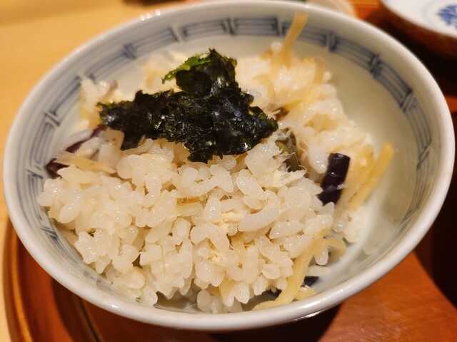 〆として、鱧と新生姜のご飯に伊勢海老の赤だし、水茄子の御漬物。