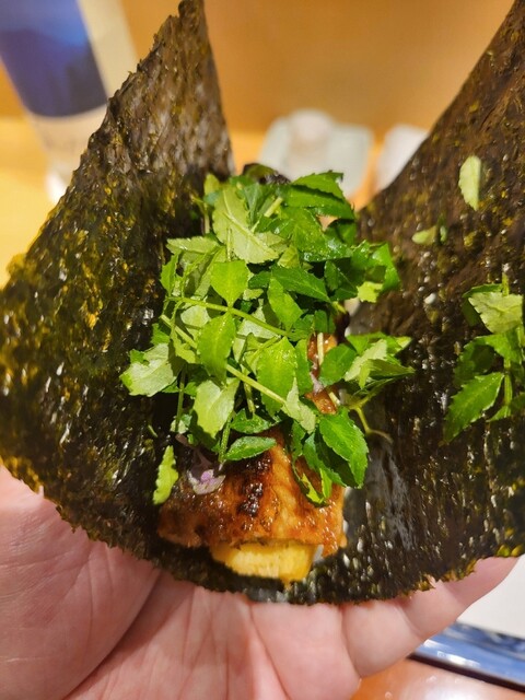 ・鰻とたまごに花山椒をたっぷり乗せた手巻き。