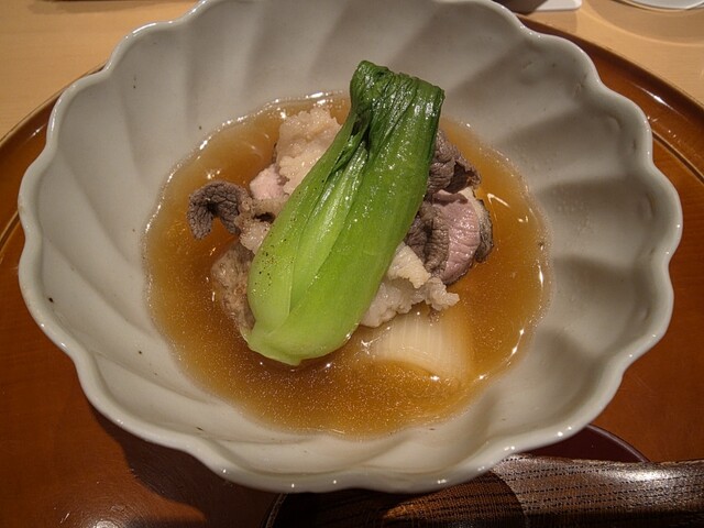 月の輪熊、黒豚とじゅんさいの煮物。