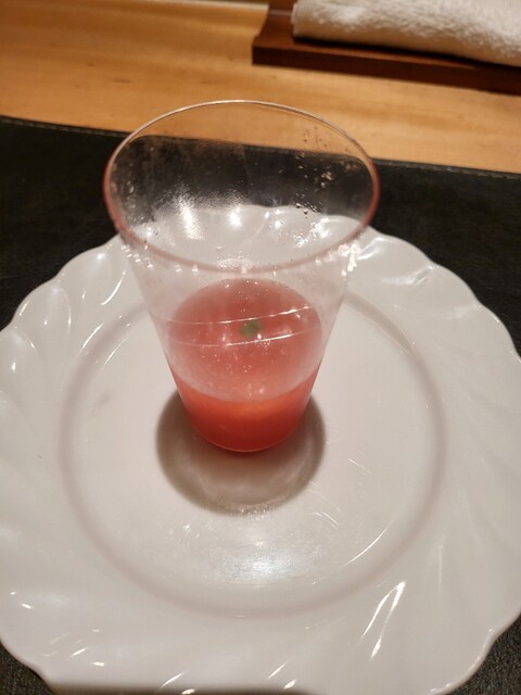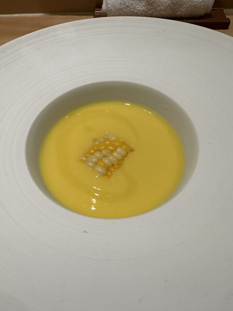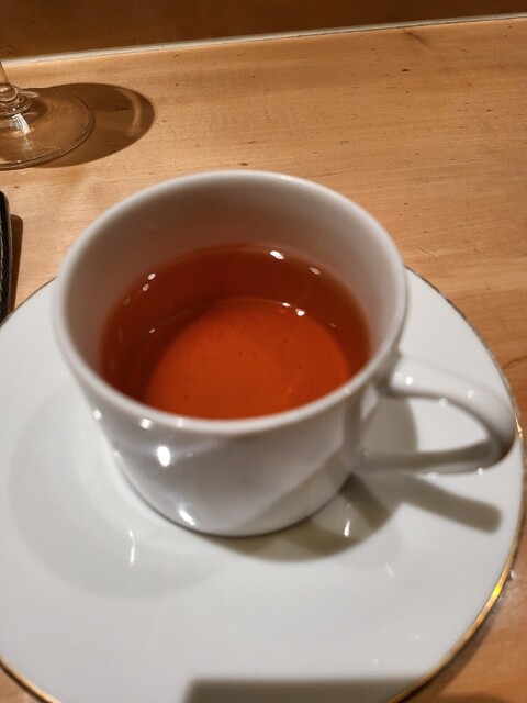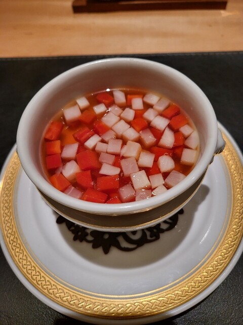 スッポンのコンソメスープ。春バージョンでホッキ貝やセリが入ってる。