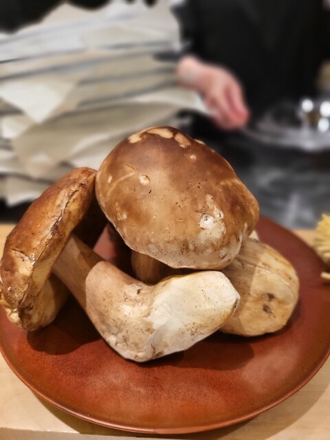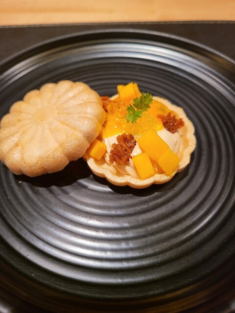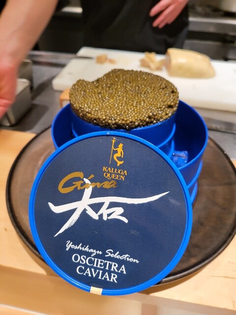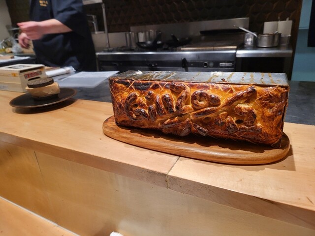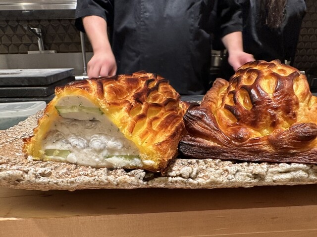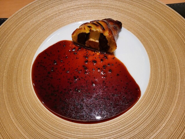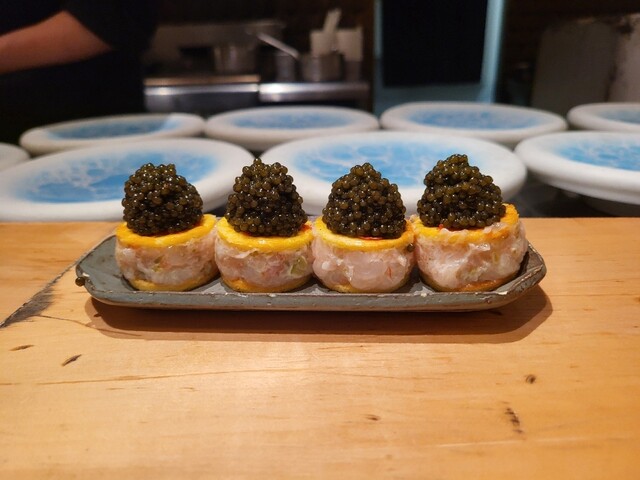 先ずはバター茶でお腹を温めてから、シュー生地に蛍烏賊、ホタテを入れて、上にキャビア。