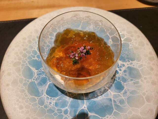 次にカリフラワーのクリームにウニを乗せジュレで。