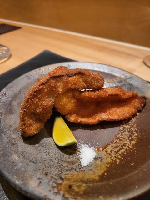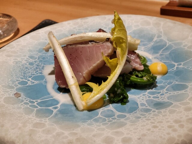 魚は鰆の皮めを炙って、レモンのソースでいただく。たんぽぽの苦味が良いアクセントに。