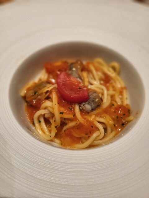 パスタは、アサリと蛤の良い出汁が効いてて、そこに高知県産のトマトが。仕上げに香辛料のハリッサを効かせた。独特だが美味しいです。