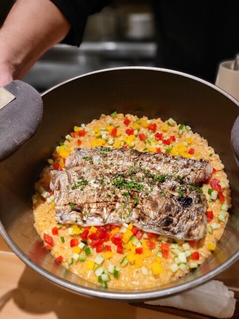 太刀魚のご飯にえびのスープをかけて、リゾット風に。