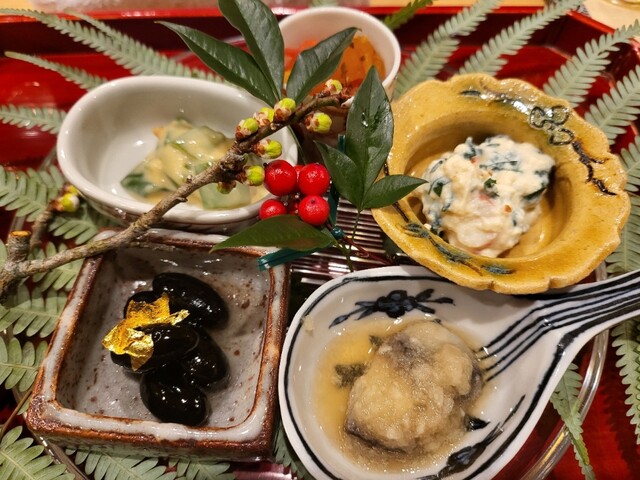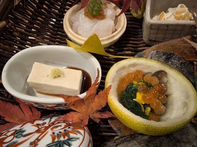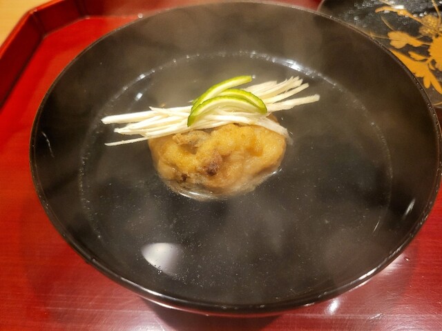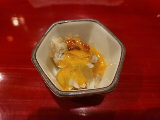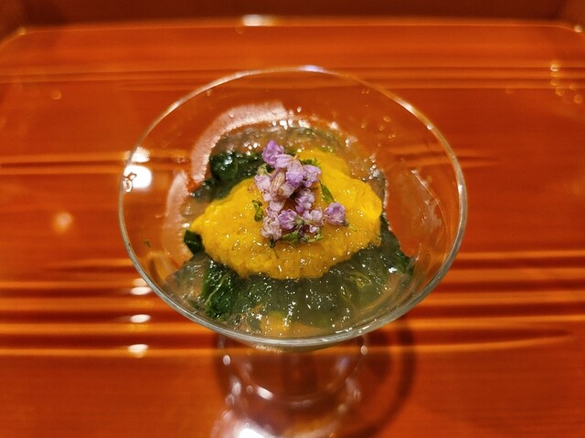 雲丹、ホッキ貝、湯葉、茄子を土佐酢のジュレで。