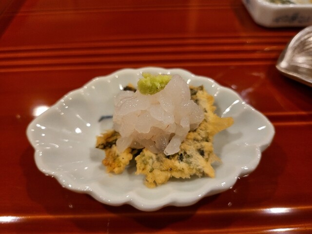 向付は、油通しした河豚に白子のソース。畳鰯、白海老に山葵。