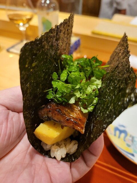 ◆鰻、玉子しんじょうに木の芽をたっぷり乗せた手巻き