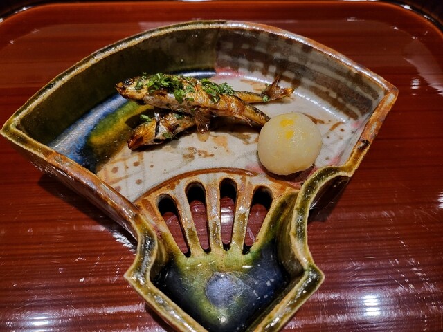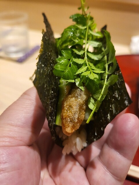 ◆揚げた稚鮎を山椒醤油で味付けし、手巻きで。木ノ芽をたっぷり添えて。