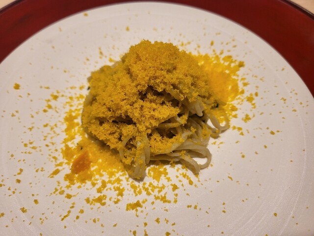 ◆定番のボタンエビと岩海苔の上に、二八蕎麦にからすみを。